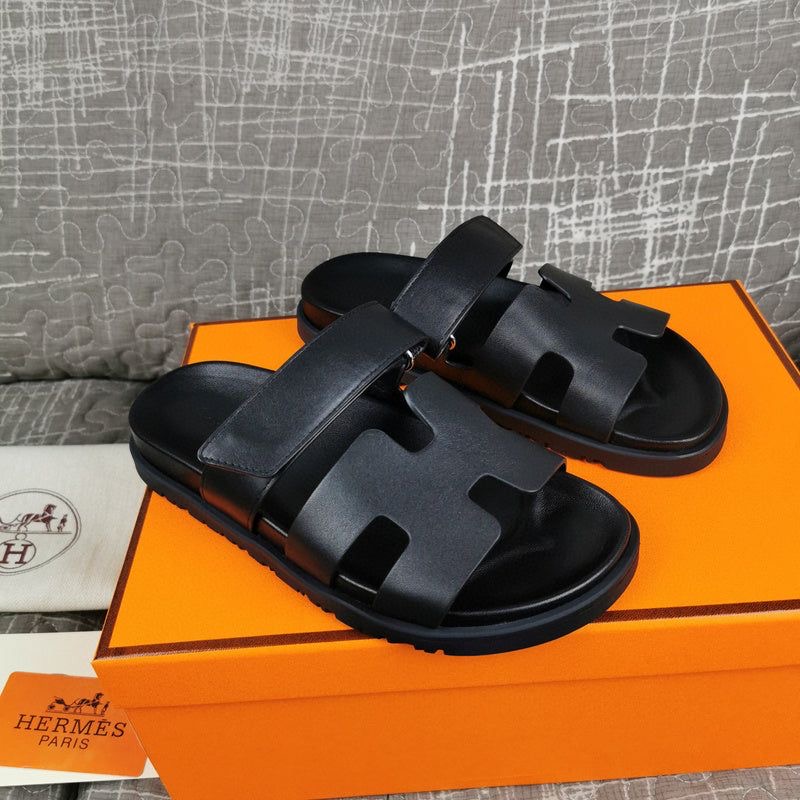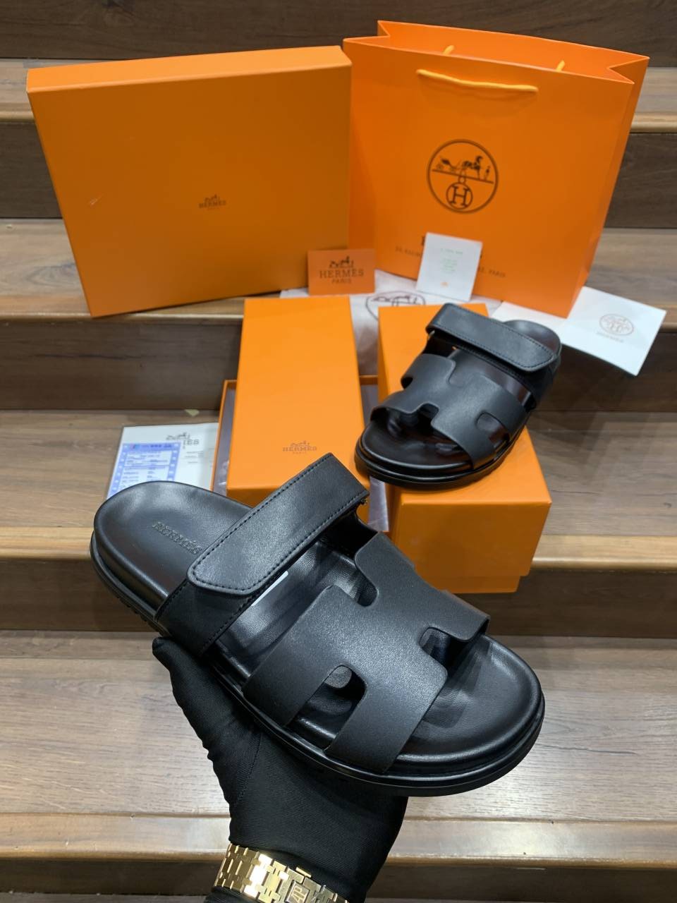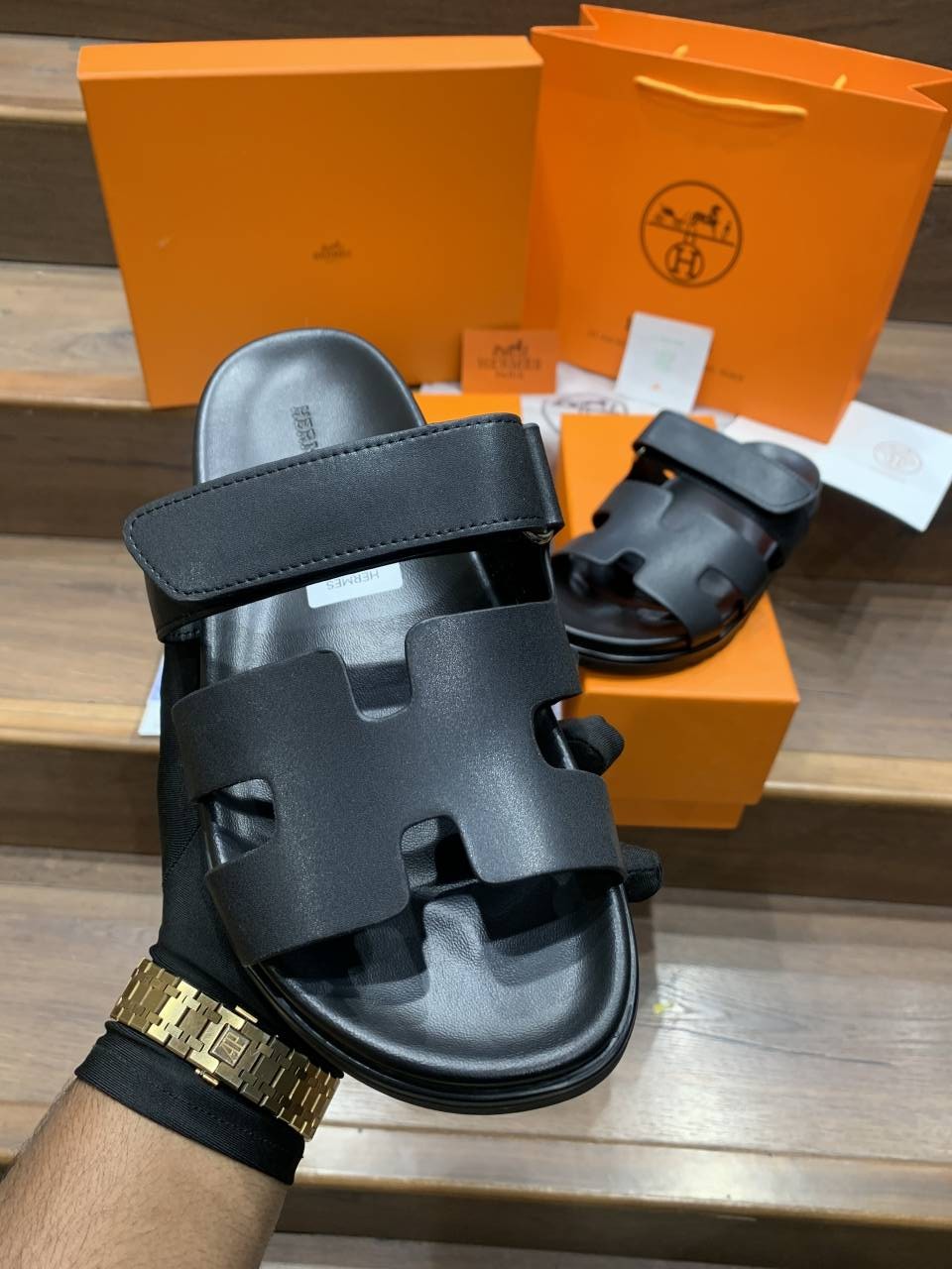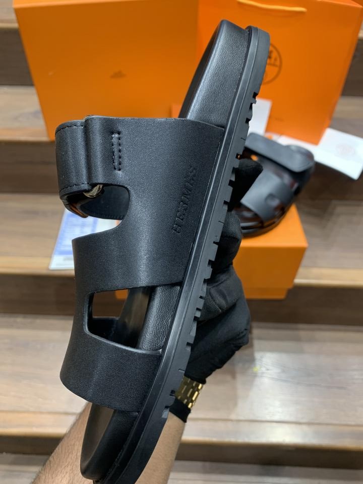 HERMES CHYPRE BLACK LEATHER PREMIUM SLIDE