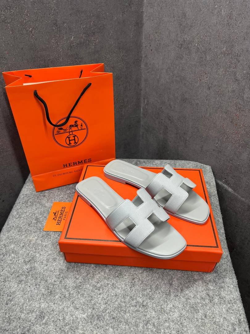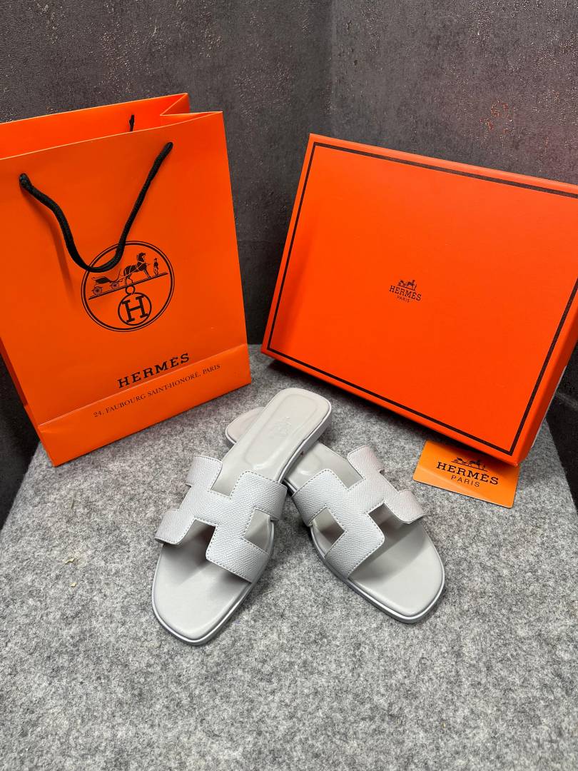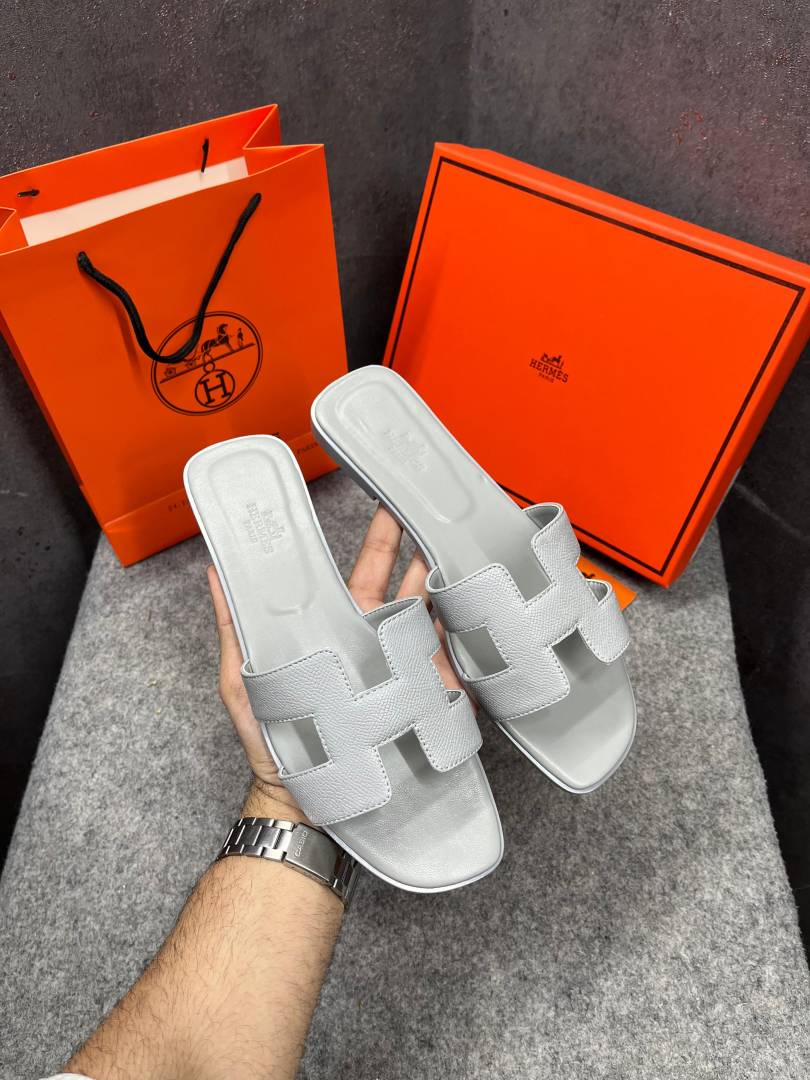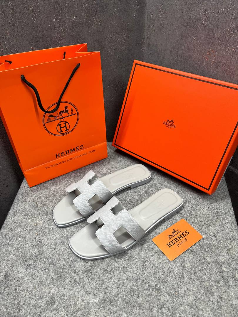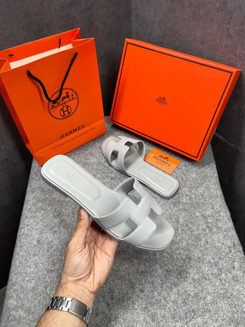 • Hermes Paris Oran Flats For Her With OG Box & Carry Bag All White Slide H38 White