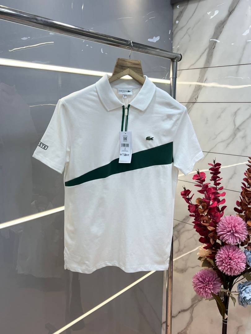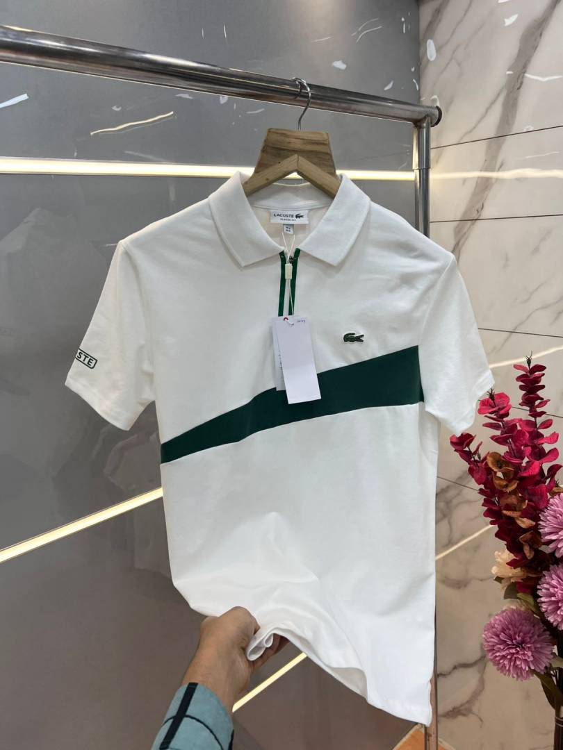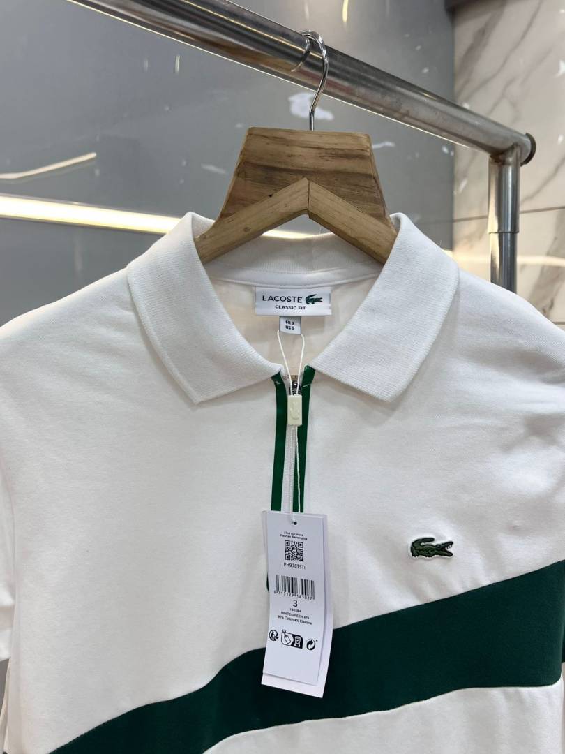 Lacost e Cream Premium Cotton Pique fabric Polo Tshirt with Shoulder Design and Embroidered Logo Zip Style 3652